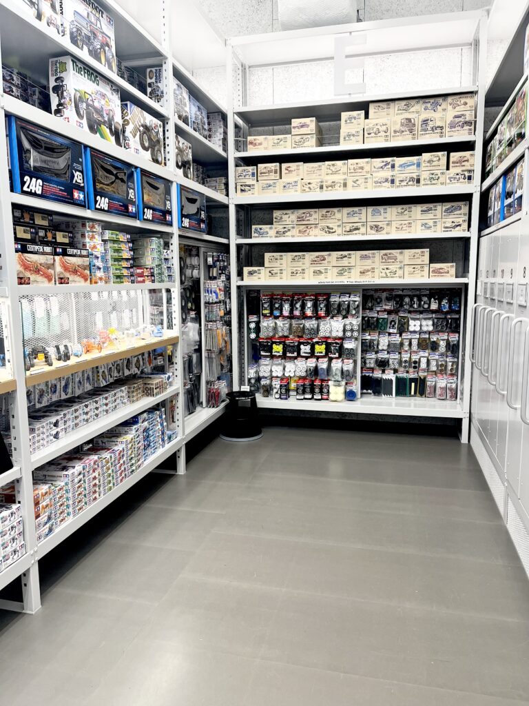 RCカーのパーツが揃うフロアは、まさに宝の山。壁一面にパーツが格納されており、あらゆるカスタマイズに対応できる品揃えです。