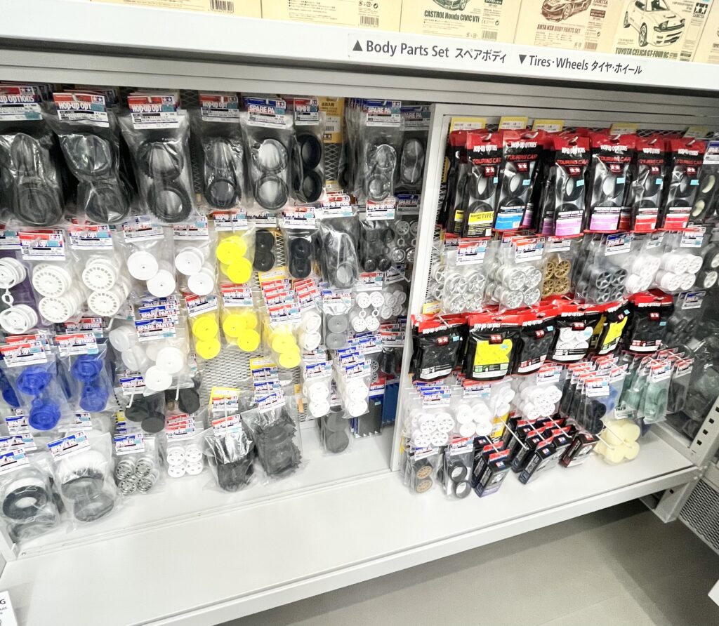 今回は目的のタイヤとホイールを購入するため、RCカーのパーツコーナーへ直行しました。壁一面に並んだパーツは圧巻です。