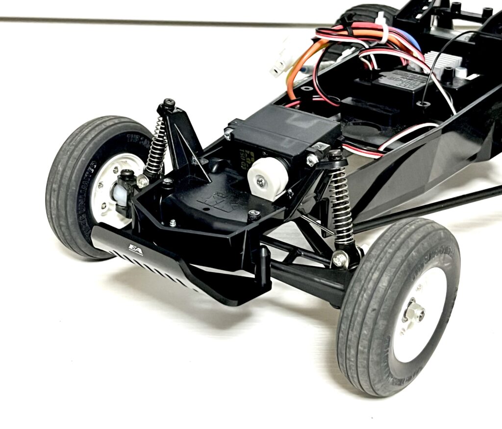 付属のビスで新しいバンパーを取り付けます。ワイドになり、黒いパーツで精悍になりました。スキッド効果で走破性アップも期待できます。