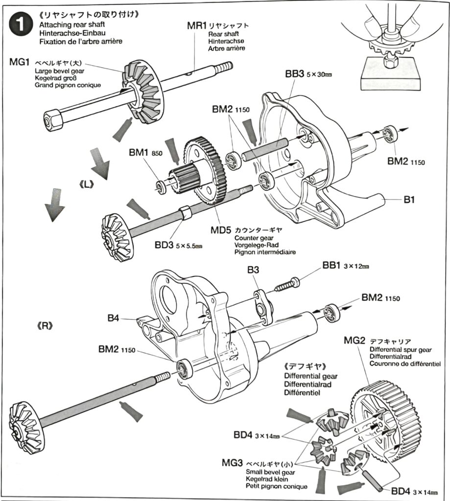For our first build session, we’ll be working on a crucial part of the drivetrain: the rear shaft and the differential gear.