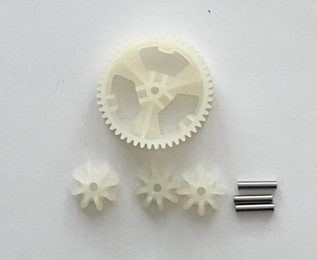 Apply grease thoroughly to all moving parts. Fit the bearings and gears in order. Check that the gears spin smoothly.