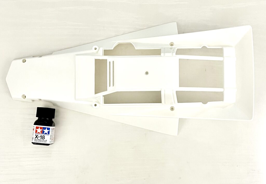 The paint I’ll be using this time is Tamiya’s enamel paint, “X-18 Semi-Gloss Black.”