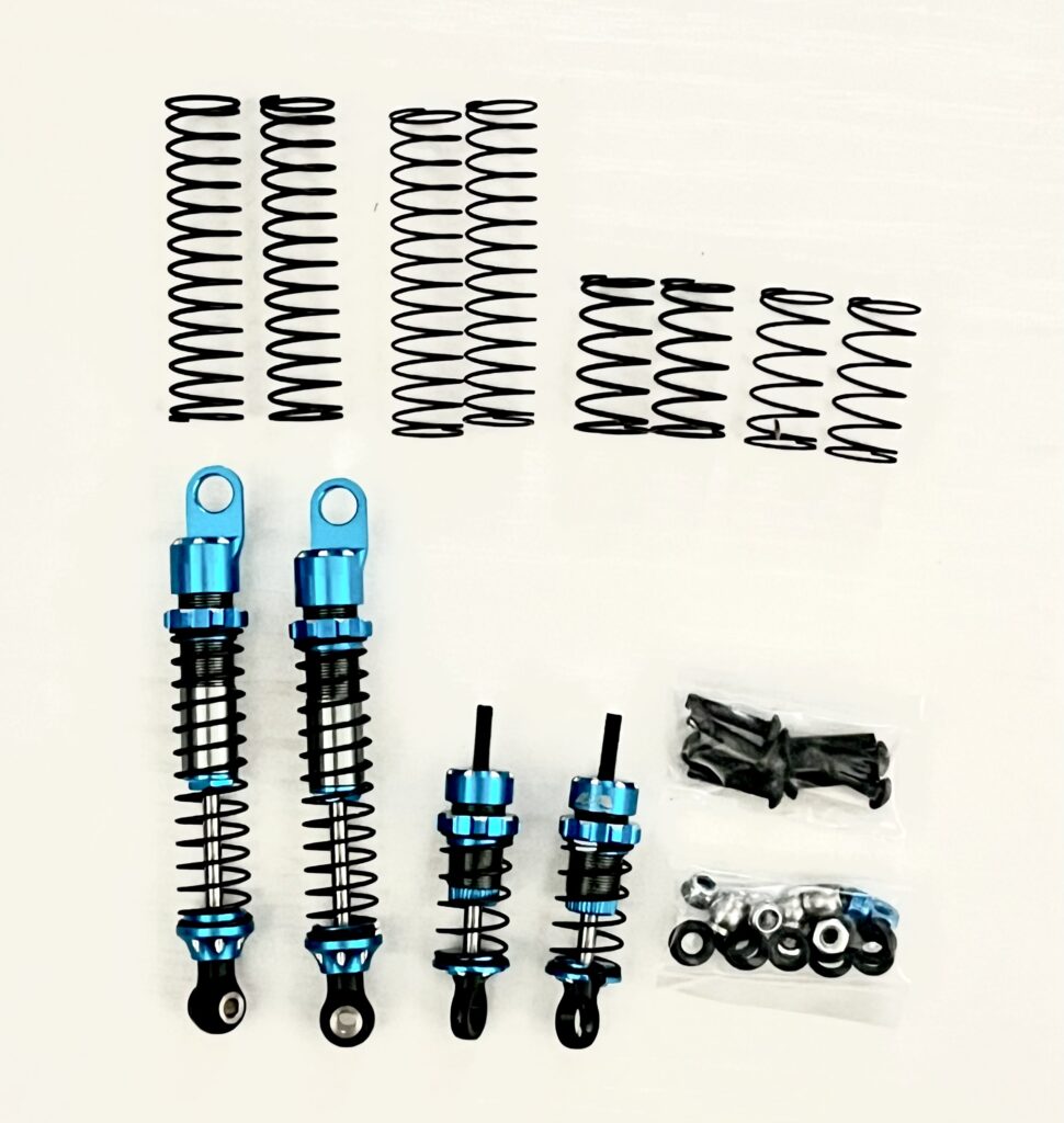 Here’s what you get inside the box. The dampers come pre-assembled, so all we need to do is fill them with oil. The set also includes two types of springs (soft and hard), allowing you to tune the suspension to match different track conditions.