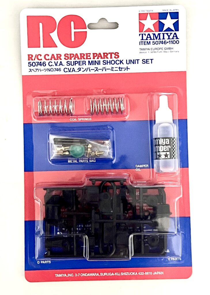 Here is the essential part for this modification: the Tamiya “CVA Super Mini Shock Unit Set.”